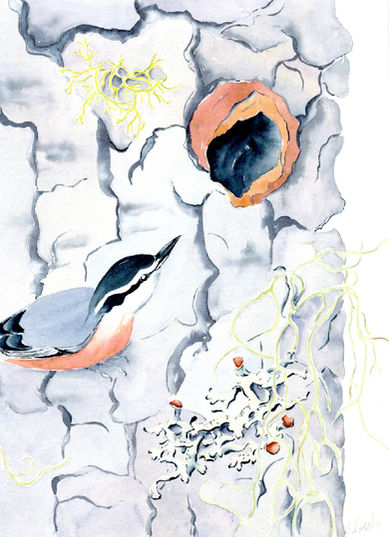 These watercolours are a result of a year’s exploration of lichens. They have proven to be a bounty of bizarre shapes and beautiful colours and a limitless supply of subject matter.